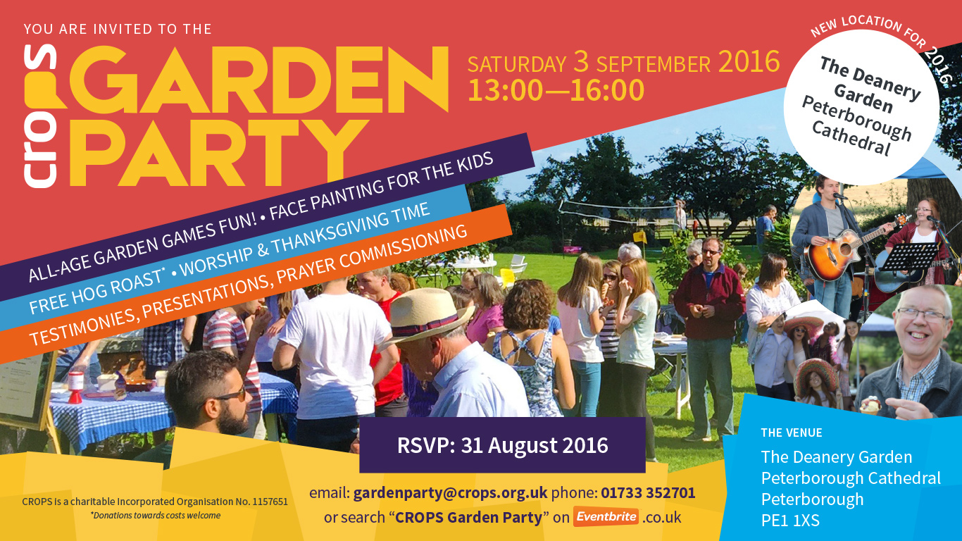 3 Sep 2016, 1-4pm. Please join us for our annual celebration of the work of CROPS. This year our garden party will be located within the Deanery Garden, at Peterborough Cathedral. This afternoon will feature testimonies from the team and stories from our work plus worship, prayer, games for the kids, his roast and more.